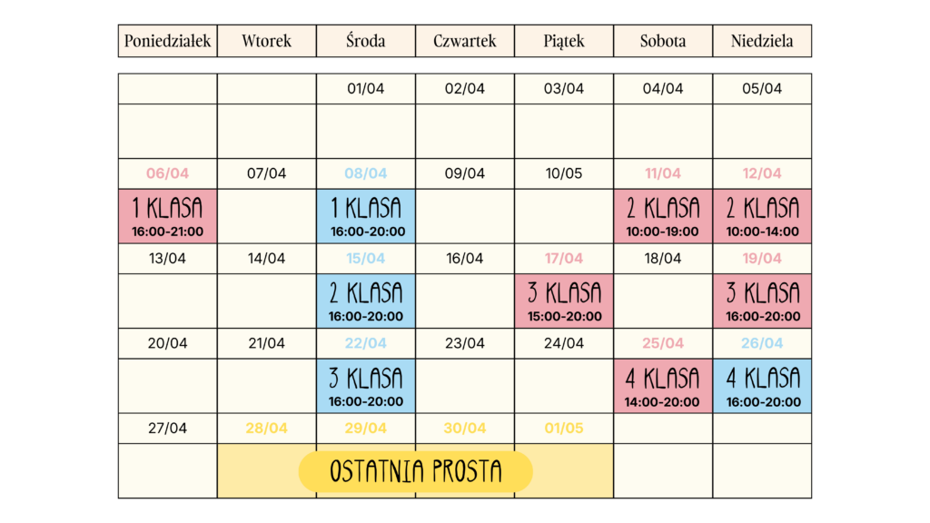 🔴 Zajęcia powtórkowe teoretyczne oraz praktyce przez cały kwiecień – różowe zajęcia to teoria, niebieskie praktyka.